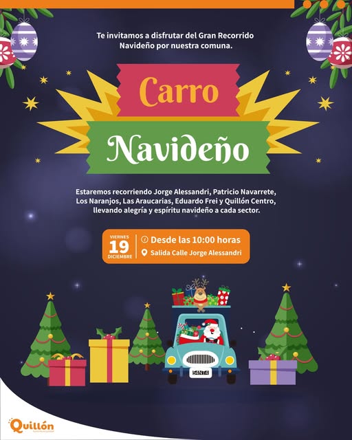 La comuna de Quillón se prepara para vivir la magia de la Navidad con el Gran Recorrido Navideño, una actividad que llevará música, alegría y espíritu festivo a distintos sectores de la ciudad. El evento se realizará este viernes 19 de diciembre desde las 10:00 horas, iniciando en calle Jorge Alessandri y pasando por Patricio Navarrete, Los Naranjos, Las Araucarias, Eduardo Frei y Quillón Centro.