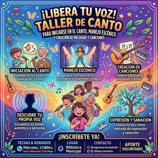 La Biblioteca Municipal de Pinto abrirá sus puertas el próximo miércoles 15 de mayo a las 17:00 horas para dar inicio al taller “¡Libera tu voz!”, una instancia pensada para quienes deseen iniciarse en el canto, ganar confianza en el escenario y explorar la creación de canciones propias.