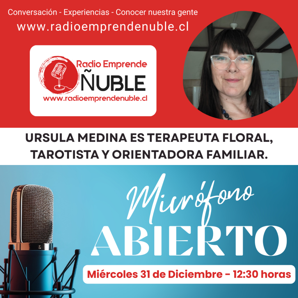 Este miércoles 31 de diciembre a las 12:30 hrs, acompáñanos en Radio Emprende Ñuble para una conversación íntima y reveladora con Ursula Medina, terapeuta floral, tarotista y orientadora familiar.