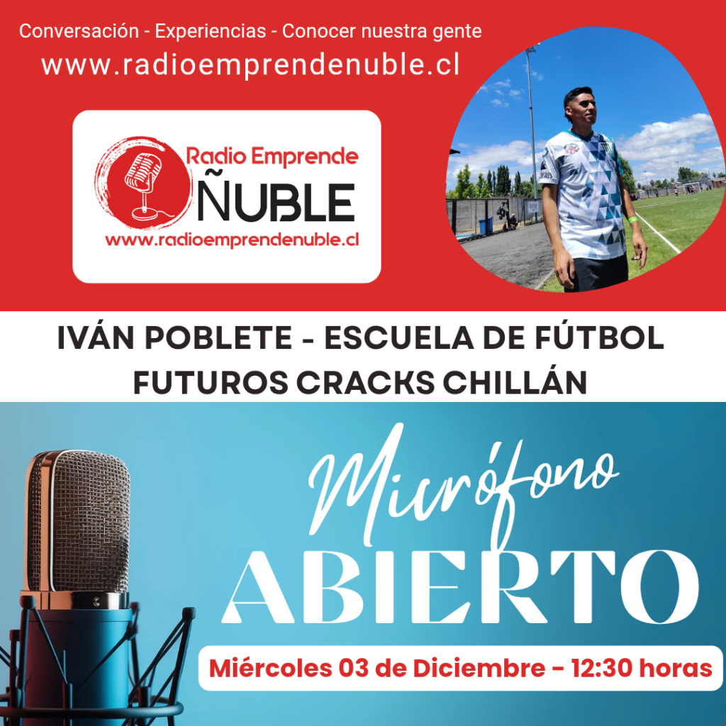 Radio Emprende Ñuble te invita al tercer capítulo de Micrófono Abierto, el espacio donde las historias locales toman protagonismo. Este miércoles 3 de diciembre a las 12:30 horas, el micrófono será para Iván Poblete, formador y referente de la Escuela de Fútbol Futuros Cracks Chillán.