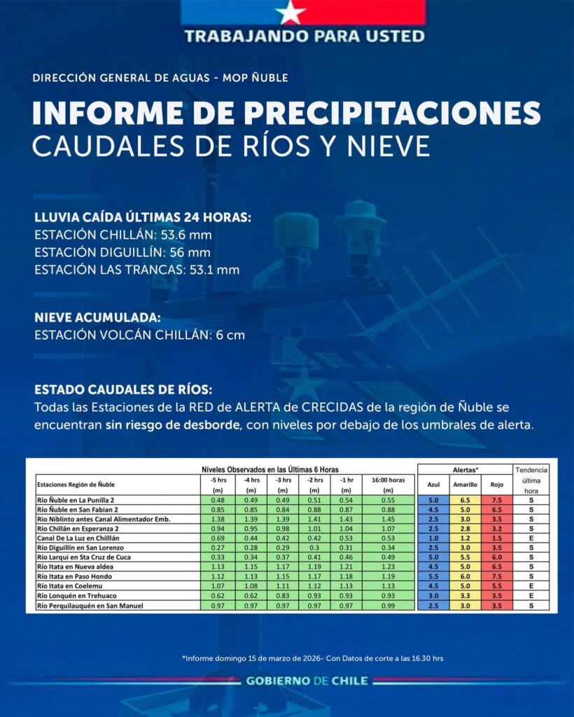 Desde el Ministerio de Obras Públicas informamos que, producto de las lluvias registradas durante la jornada, se reportan algunos anegamientos en caminos, pero sin cortes de rutas ni daños a infraestructura bajo supervisión del MOP.