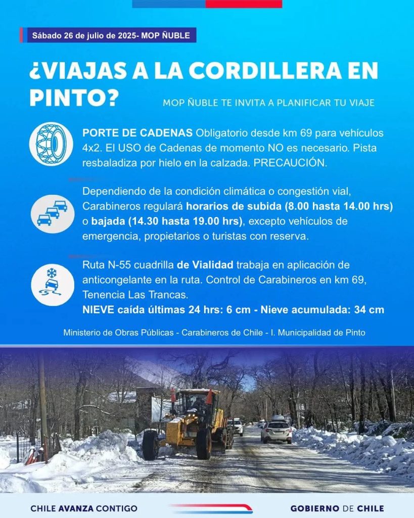 📍 Ruta N-55 desde #Pinto a #NevadosDeChillán despejada. Porte obligatorio de cadenas para vehículos 4×2 y su de momento NO es necesario. ⚠️