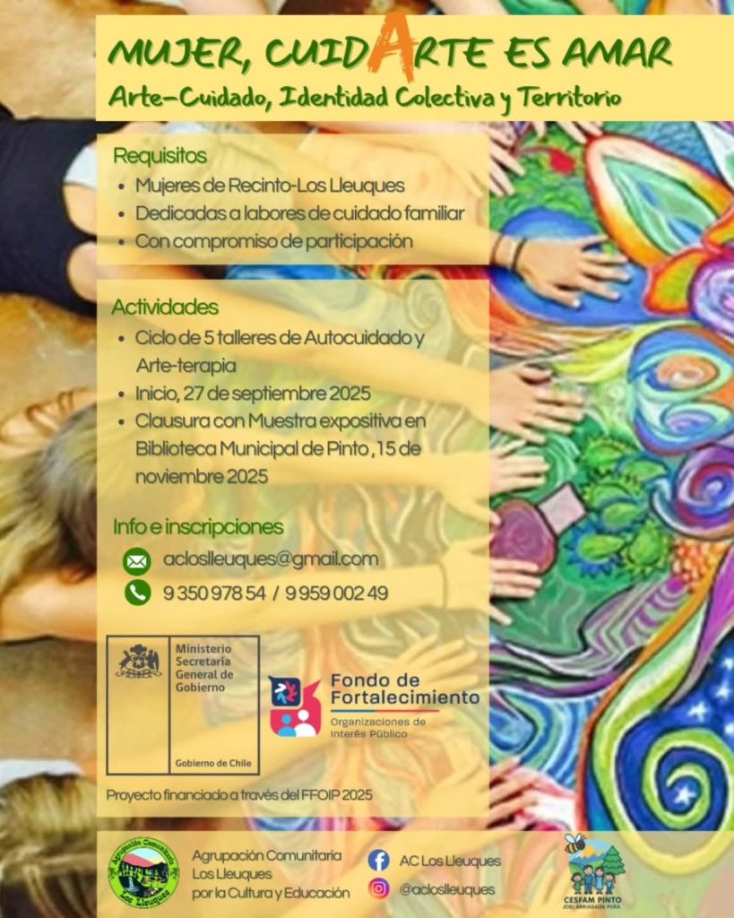 El proyecto Mujer CuidArte es Amar, adjudicado por la Agrupación Comunitaria de Los Lleuques es una Iniciativa apoyada por el FFOIP 2025 de la Secretaría General de Gobierno.