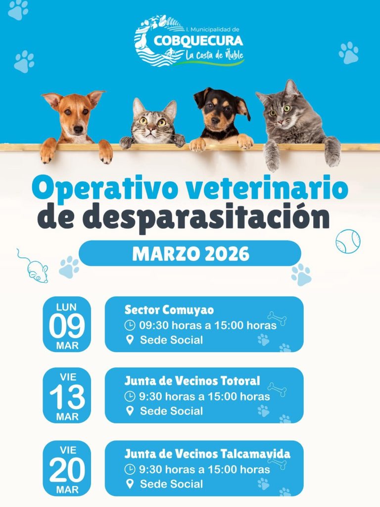 Durante marzo de 2026, la Municipalidad de Cobquecura realizará un operativo veterinario de desparasitación dirigido a perros y gatos de la comuna.