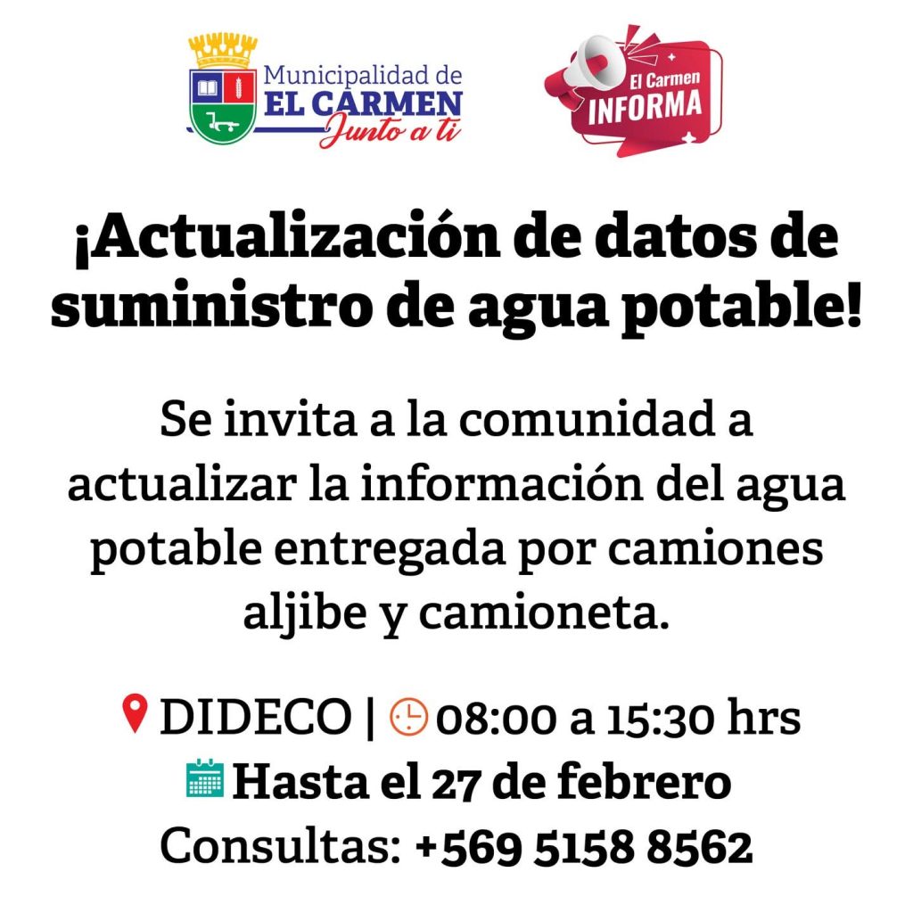 La Municipalidad de El Carmen informó a la comunidad sobre el proceso de actualización de datos del suministro de agua potable entregado por camiones aljibe y camionetas. El trámite se realiza en DIDECO entre las 08:00 y 15:30 horas, hasta el 27 de febrero. Para consultas, se habilitó el número +569 5158 8562.