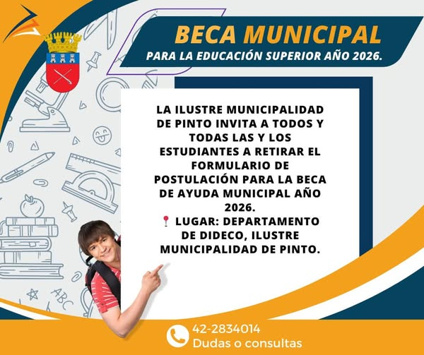La Ilustre Municipalidad de Pinto invita a estudiantes que inicien estudios en Educación Superior o que ya se encuentren cursando una carrera, a postular a la Beca Municipal 2026. Los formularios de postulación pueden retirarse en el Departamento DIDECO.