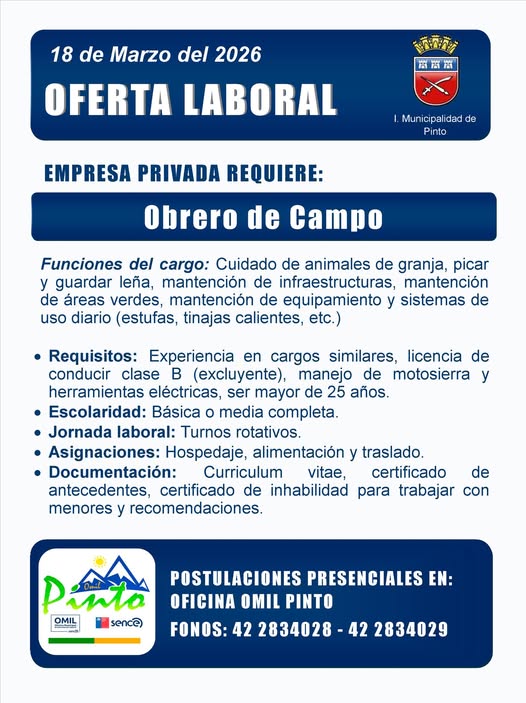 El 18 de marzo de 2026, la Municipalidad de Pinto difundió una oferta laboral de una empresa privada que busca contratar a un Obrero de Campo. El cargo contempla funciones como cuidado de animales de granja, mantención de áreas verdes e infraestructuras, además de manejo de herramientas eléctricas.