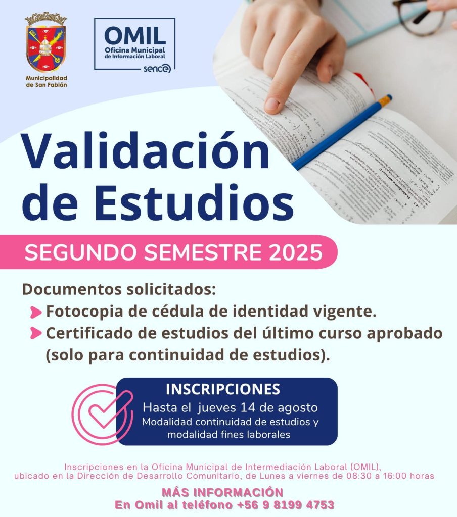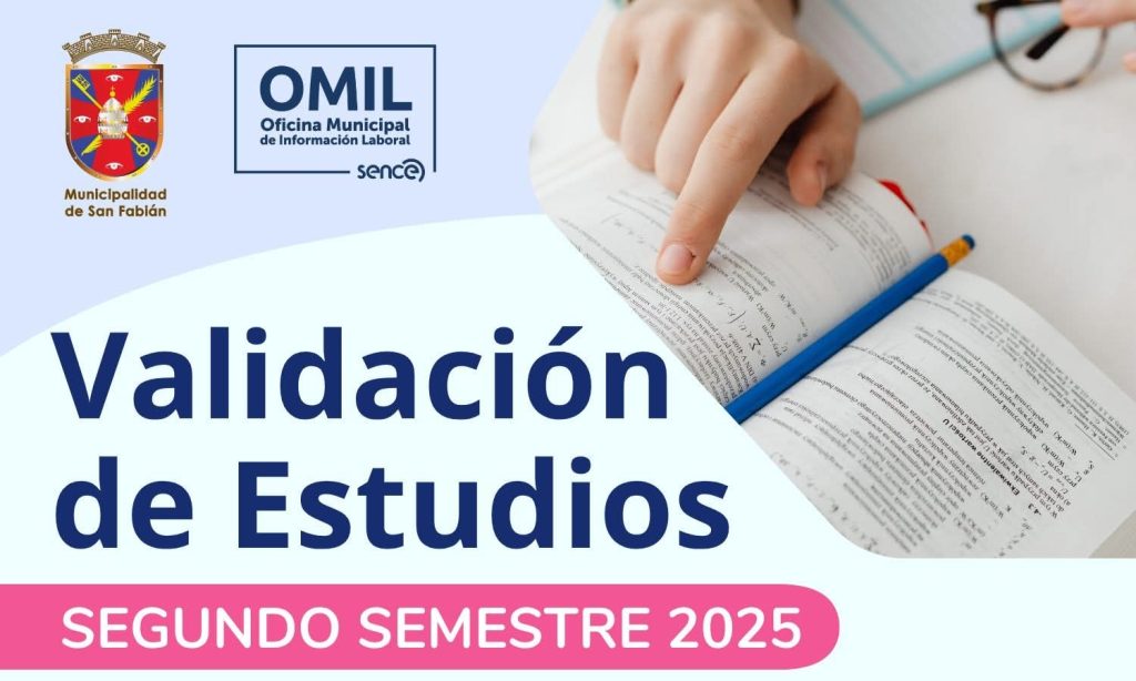 La Municipalidad de San Fabián, a través de su Oficina Municipal de Información Laboral (OMIL), ha iniciado el proceso de inscripción para la Validación de Estudios correspondiente al segundo semestre del año 2025.