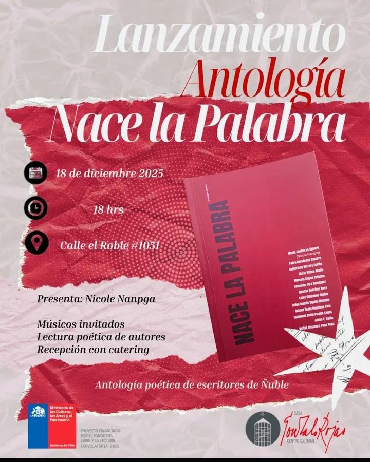 Este jueves 18 de diciembre a las 18:00 horas se realizará el lanzamiento de la antología Nace la Palabra, una obra que reúne a escritores de Ñuble en una celebración de la poesía local.