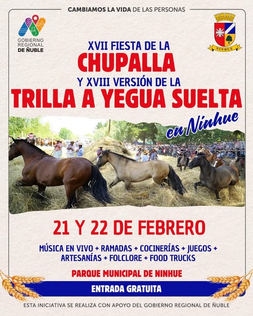 El Parque Municipal de Ninhue será escenario de la XVII Fiesta de la Chupalla y XVIII Trilla a Yegua Suelta, los días 21 y 22 de febrero. La actividad contará con música en vivo, ramadas, juegos, artesanías, folclore y food trucks, en un ambiente familiar y con entrada gratuita.