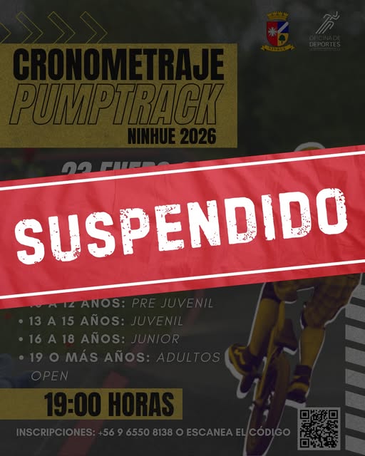 La Ilustre Municipalidad de Ninhue informa a la comunidad la suspensión del Cronometraje Pumptrack Ninhue 2026, debido a los sucesos acontecidos recientemente en la región. Esta decisión se ha tomado de manera preventiva, priorizando la seguridad y el bienestar de las y los participantes.