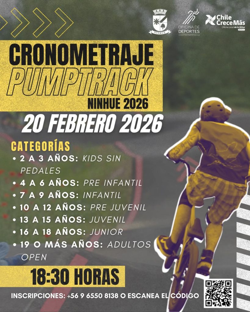 El próximo viernes 20 de febrero, a las 18:30 horas, la pista de pumptrack de Ninhue recibirá a ciclistas de todas las edades en una jornada de cronometraje organizada por la Oficina de Deportes y Chile Crece Más.
