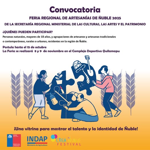La SEREMI de las Culturas, las Artes y el Patrimonio de Ñuble junto a INDAP invitan a artesanos y artesanas de toda la región a postular para ser parte de este gran encuentro, que se realizará el 8 y 9 de noviembre en el Complejo Deportivo Quilamapu, Chillán.