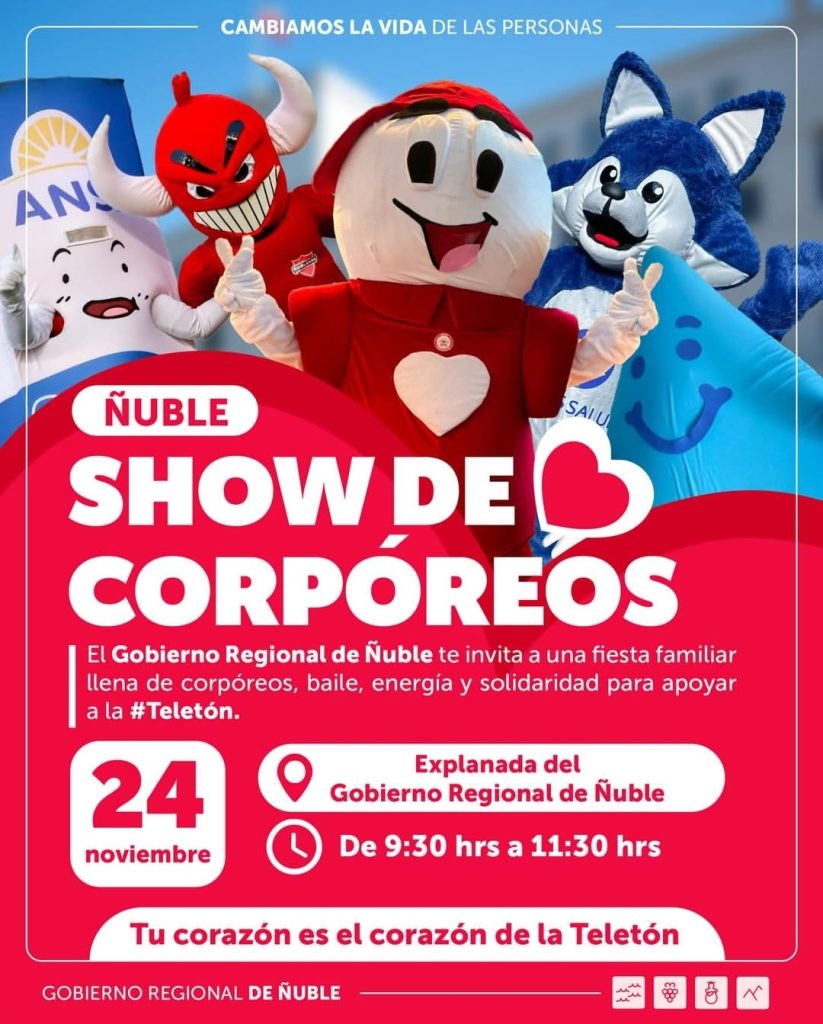 Este domingo 24 de noviembre, la explanada del Gobierno Regional de Ñuble se transformará en un escenario de alegría, baile y compromiso social con el esperado Show de Corpóreos. Desde las 9:30 hasta las 11:30 horas, familias de toda la región están invitadas a disfrutar de una fiesta llena de personajes corpóreos, música y energía positiva, en apoyo a la campaña nacional de la Teletón.