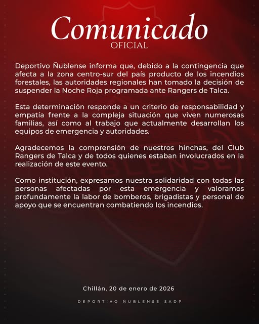 Deportivo Ñublense anunció la suspensión de la esperada Noche Roja frente a Rangers de Talca, debido a la emergencia provocada por los incendios forestales en la zona centro-sur del país. La decisión fue tomada por las autoridades regionales como muestra de responsabilidad y empatía ante la difícil situación que enfrentan numerosas familias y el intenso trabajo de los equipos de emergencia.