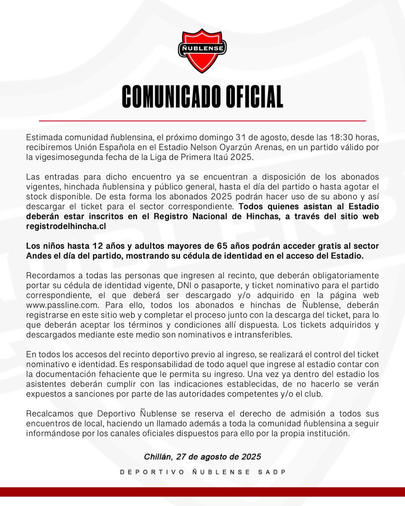 InicioNOTICIAS ÑUBLEÑublense vs Unión Española: Comunicado oficial y venta de estradas Ñublense vs Unión Española: Comunicado oficial y venta de estradas Deja un comentario / DEPORTES, NOTICIAS ÑUBLE Compartir Deportivo Ñublense entrega Información oficial: Venta de entradas vs Unión Española. ¡𝐀𝐜𝐨𝐦𝐩𝐚𝐧̃𝐞𝐦𝐨𝐬 𝐚 𝐥𝐨𝐬 𝐃𝐢𝐚𝐛𝐥𝐨𝐬 𝐑𝐨𝐣𝐨𝐬 𝐞𝐧 𝐞𝐬𝐭𝐞 𝐢𝐦𝐩𝐨𝐫𝐭𝐚𝐧𝐭𝐞 𝐝𝐞𝐬𝐚𝐟𝐢́𝐨 𝐞𝐧 𝐜𝐚𝐬𝐚! Fuente: Deportivo Ñublense Visitas: 2