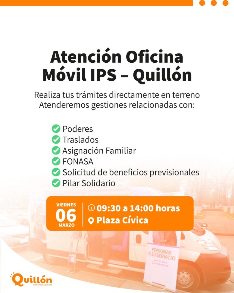 Este viernes 6 de marzo, la Plaza Cívica de Quillón recibirá la visita de la oficina móvil del Instituto de Previsión Social (IPS).
