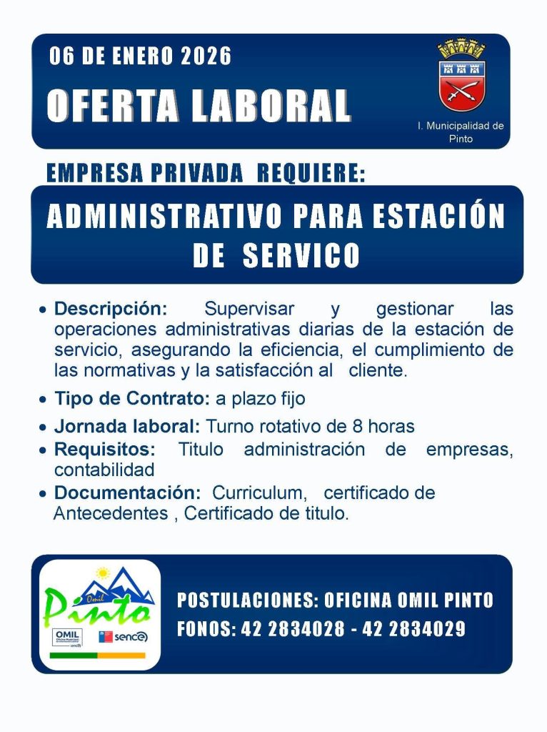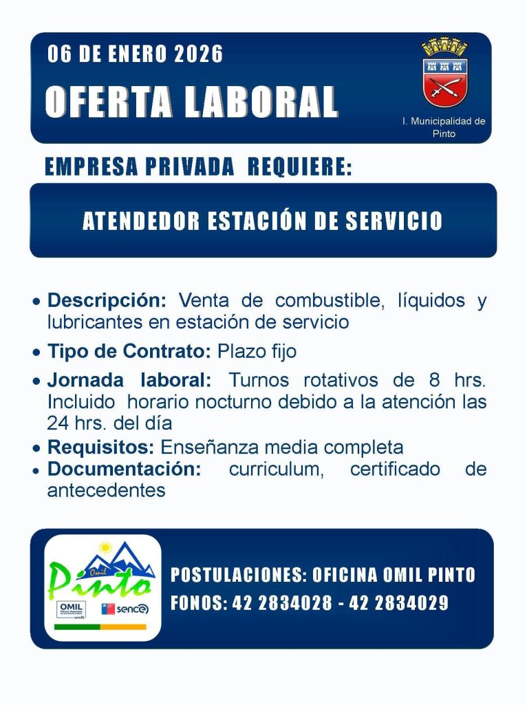 La Oficina Municipal de Intermediación Laboral (OMIL) de Pinto informa que se encuentran disponibles diversas ofertas de trabajo para la comunidad.