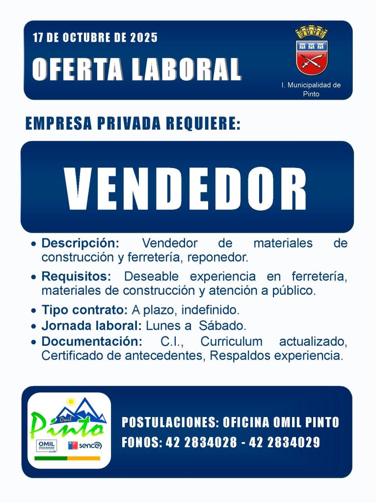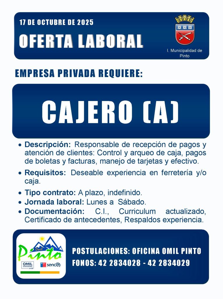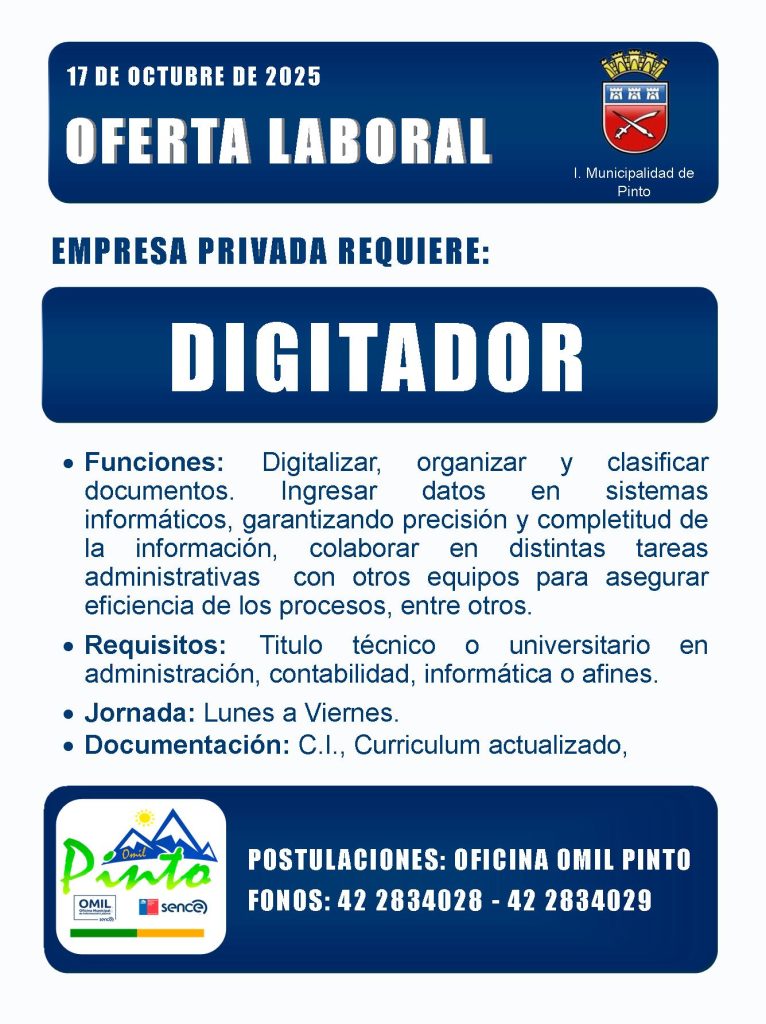La Oficina Municipal de Intermediación Laboral (OMIL) de Pinto informa a la comunidad sobre nuevas oportunidades de empleo disponibles en la comuna y sus alrededores. Quienes estén en búsqueda de trabajo pueden acercarse a la oficina para recibir orientación personalizada y apoyo en el proceso de postulación.
