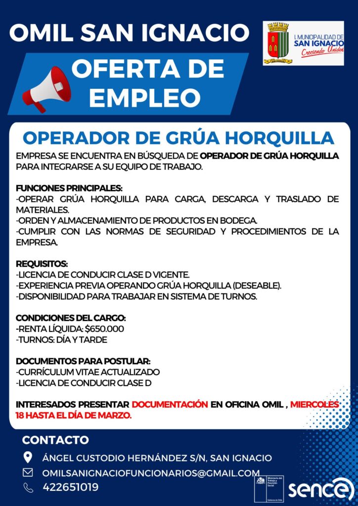 La Oficina Municipal de Intermediación Laboral (OMIL) de San Ignacio informó la apertura de una vacante para el cargo de Operador de Grúa Horquilla, con renta líquida de $650.000 y sistema de turnos día y tarde.