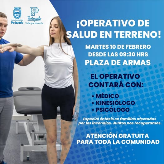 La Municipalidad de Portezuelo anunció un operativo de salud en terreno que se realizará el martes 10 de febrero desde las 09:30 horas en la Plaza de Armas. La jornada contará con atención gratuita de médico, kinesiólogo y psicólogo, con especial énfasis en apoyar a las familias afectadas por los recientes incendios. La iniciativa busca acompañar a la comunidad en su proceso de recuperación y garantizar acceso a servicios básicos de salud.