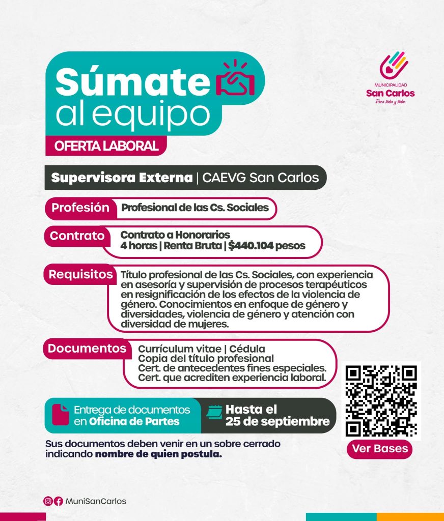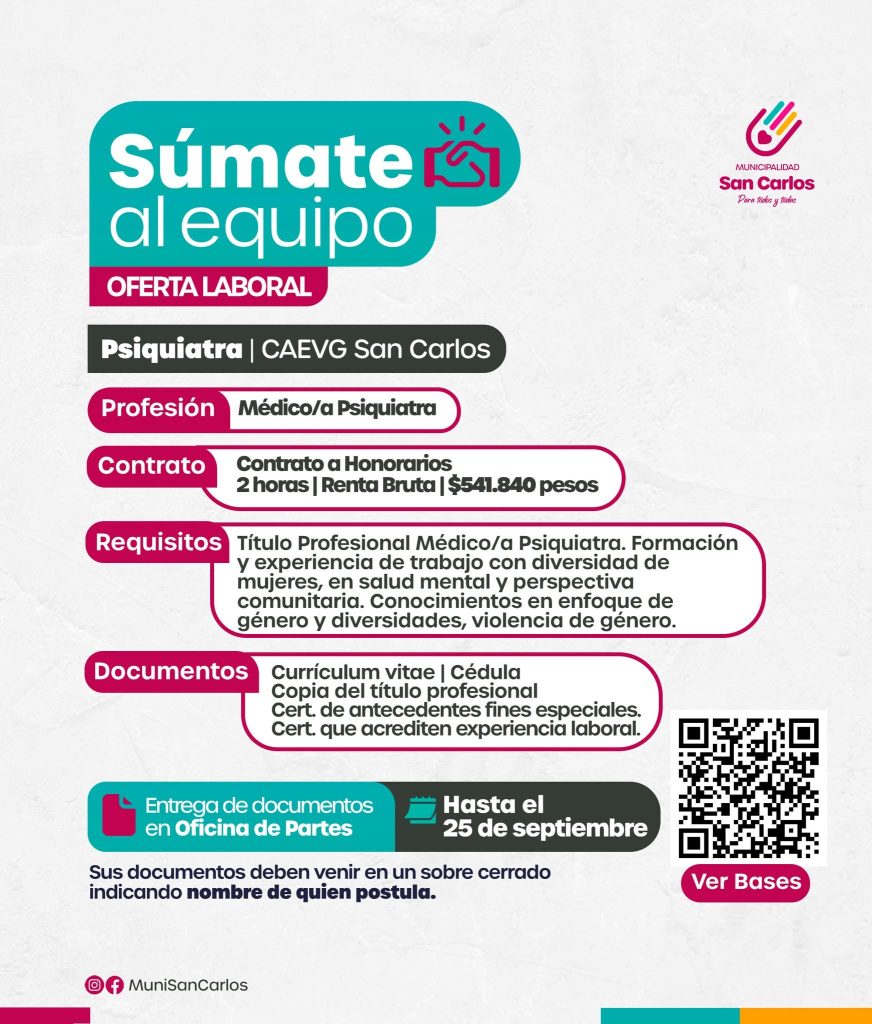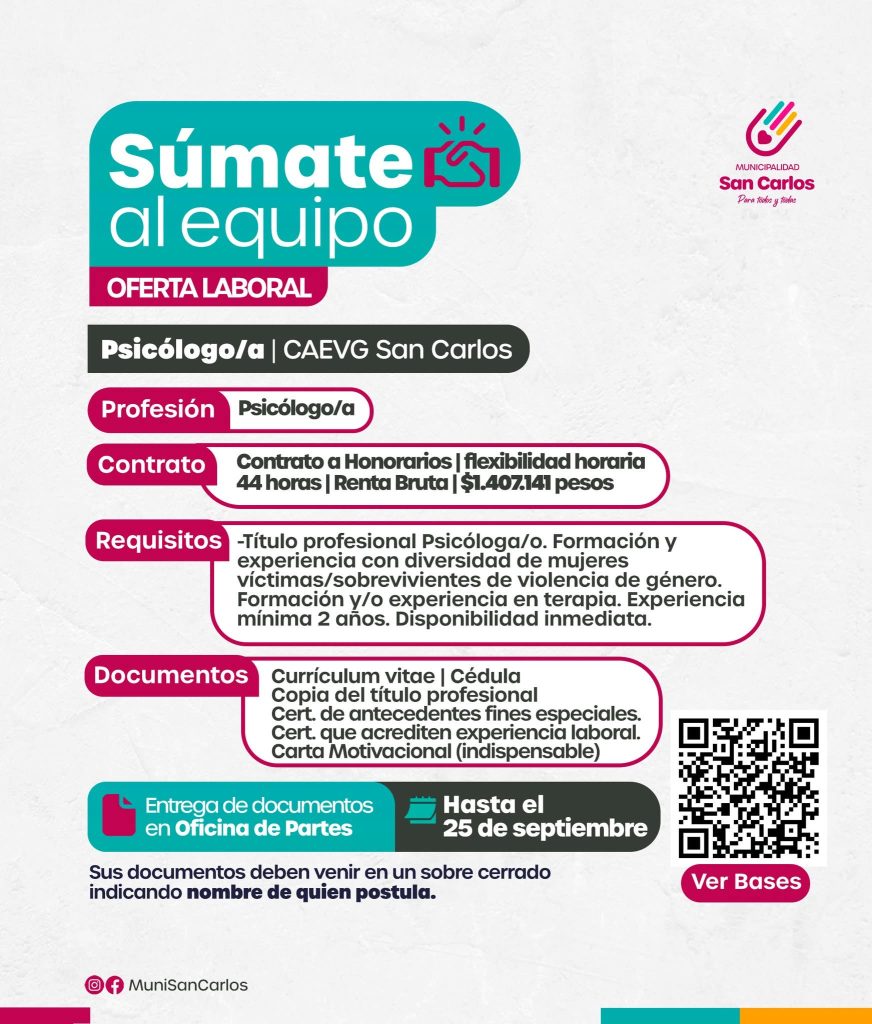 La Ilustre Municipalidad de San Carlos busca a los próximos integrantes del equipo del Centro de Atención Especializada en Violencias de Género.