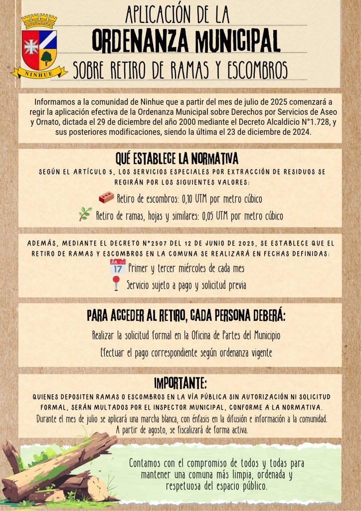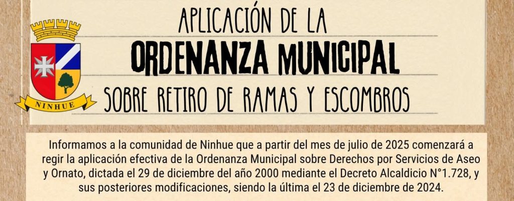 Informamos a la comunidad de Ninhue que a partir del mes de julio de 2025 comenzará a regir la aplicación efectiva de la Ordenanza Municipal sobre Derechos por Servicios de Aseo y Ornato, dictada el 29 de diciembre del año 2000 mediante el Decreto Alcaldicio N°1.728, y sus posteriores modificaciones, siendo la última el 23 de diciembre de 2024.