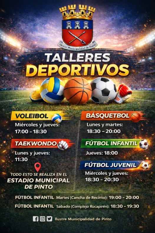 La Ilustre Municipalidad de Pinto invita a la comunidad a participar en sus talleres deportivos gratuitos, realizados en el Estadio Municipal y otros recintos locales. Las disciplinas incluyen voleibol, básquetbol, taekwondo y fútbol infantil y juvenil, con horarios variados durante la semana. Esta iniciativa busca fomentar el deporte, la vida saludable y el encuentro comunitario. ¡Todos están bienvenidos a sumarse!