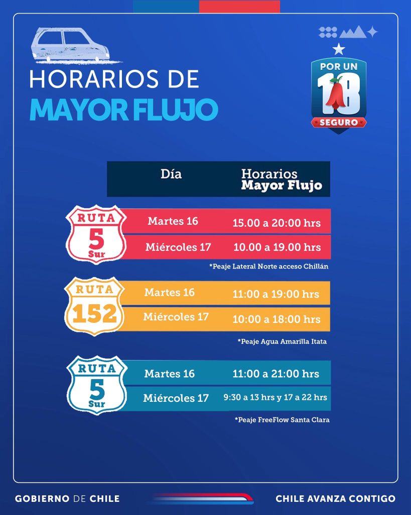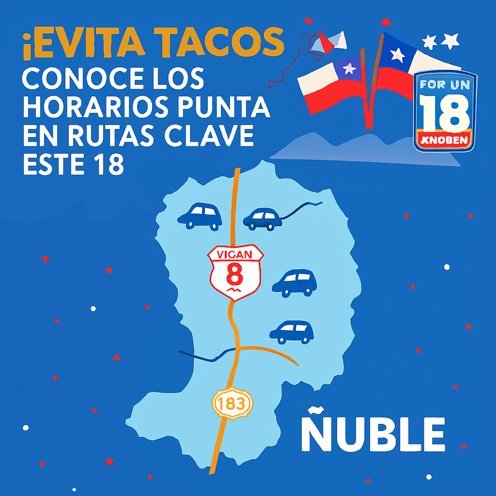 Con motivo de las celebraciones del 18 de septiembre, el Gobierno de Chile lanzó la campaña “Por un 18 Seguro”, destacando los horarios de mayor congestión en rutas clave de la Región de Ñuble. Según el afiche informativo, se espera alto flujo vehicular en la Ruta 5 Sur, Ruta 152 y el peaje FreeFlow Santa Clara entre el martes 16 y miércoles 17. Se recomienda planificar los viajes con anticipación para evitar aglomeraciones y contribuir a un tránsito más seguro durante el feriado.