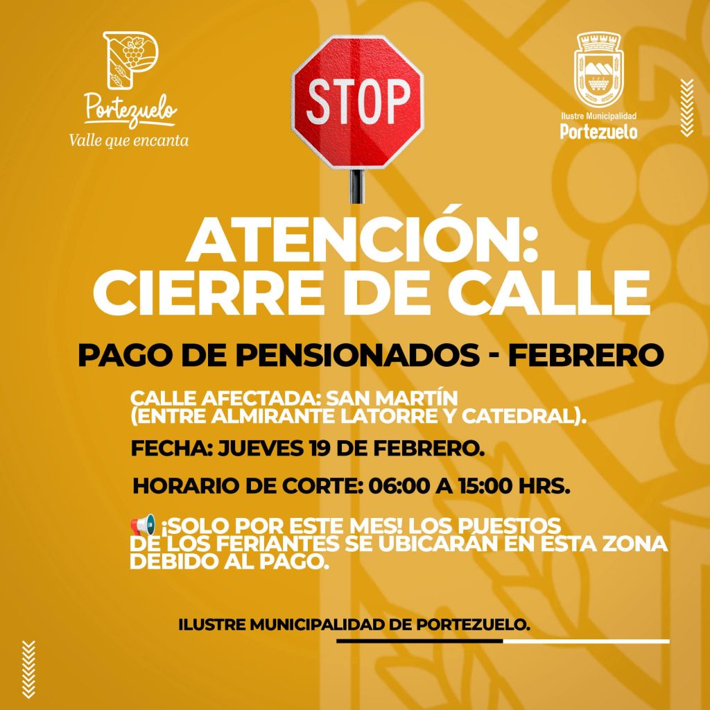 La Ilustre Municipalidad de Portezuelo informó que este jueves 19 de febrero se realizará un cierre temporal en calle San Martín, entre Almirante Latorre y Catedral, desde las 06:00 hasta las 15:00 horas.