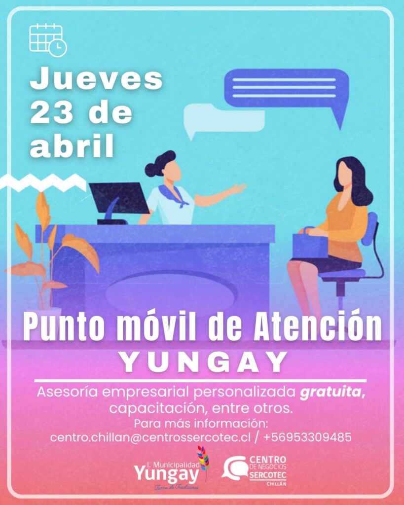 Este jueves 23 de abril se instalará en Yungay el Punto Móvil de Atención del Centro de Negocios SERCOTEC Chillán, ofreciendo asesoría empresarial personalizada gratuita, capacitación y apoyo a emprendedores.