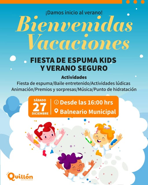 Este sábado 27 de diciembre, el Balneario Municipal de Quillón será el epicentro de la alegría infantil con la “Fiesta de Espuma Kids y Verano Seguro”. Desde las 16:00 horas, niñas y niños podrán disfrutar de actividades lúdicas, música, animación, premios y un refrescante punto de hidratación.
