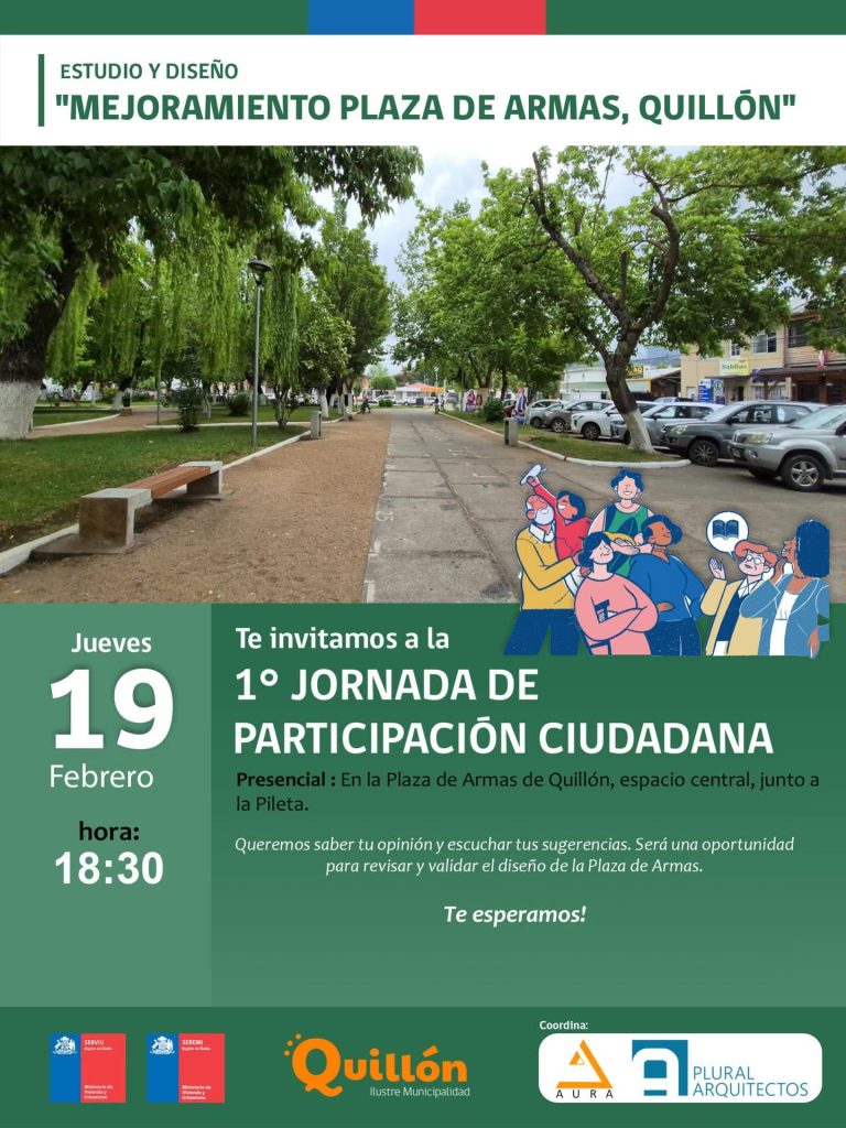 La iniciativa es organizada por la Ilustre Municipalidad de Quillón junto a AURA y Plural Arquitectos, con el apoyo del Ministerio de Vivienda y Urbanismo y SERVIU Ñuble.