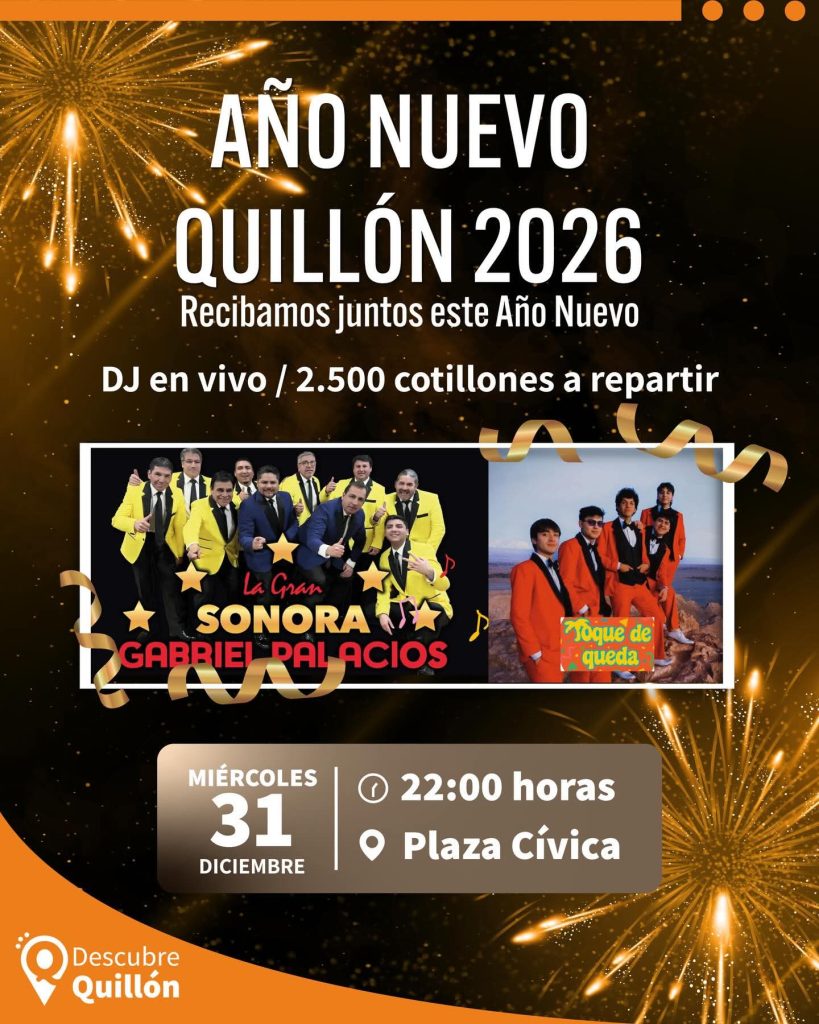 Este miércoles 31 de diciembre, Quillón celebrará la llegada del Año Nuevo con una gran fiesta en la Plaza Cívica desde las 22:00 horas. El evento contará con la presentación en vivo de La Gran Sonora Gabriel Palacios y Toque de Queda, además de un DJ que animará la noche. Se repartirán 2.500 cotillones para dar color y alegría a la jornada.