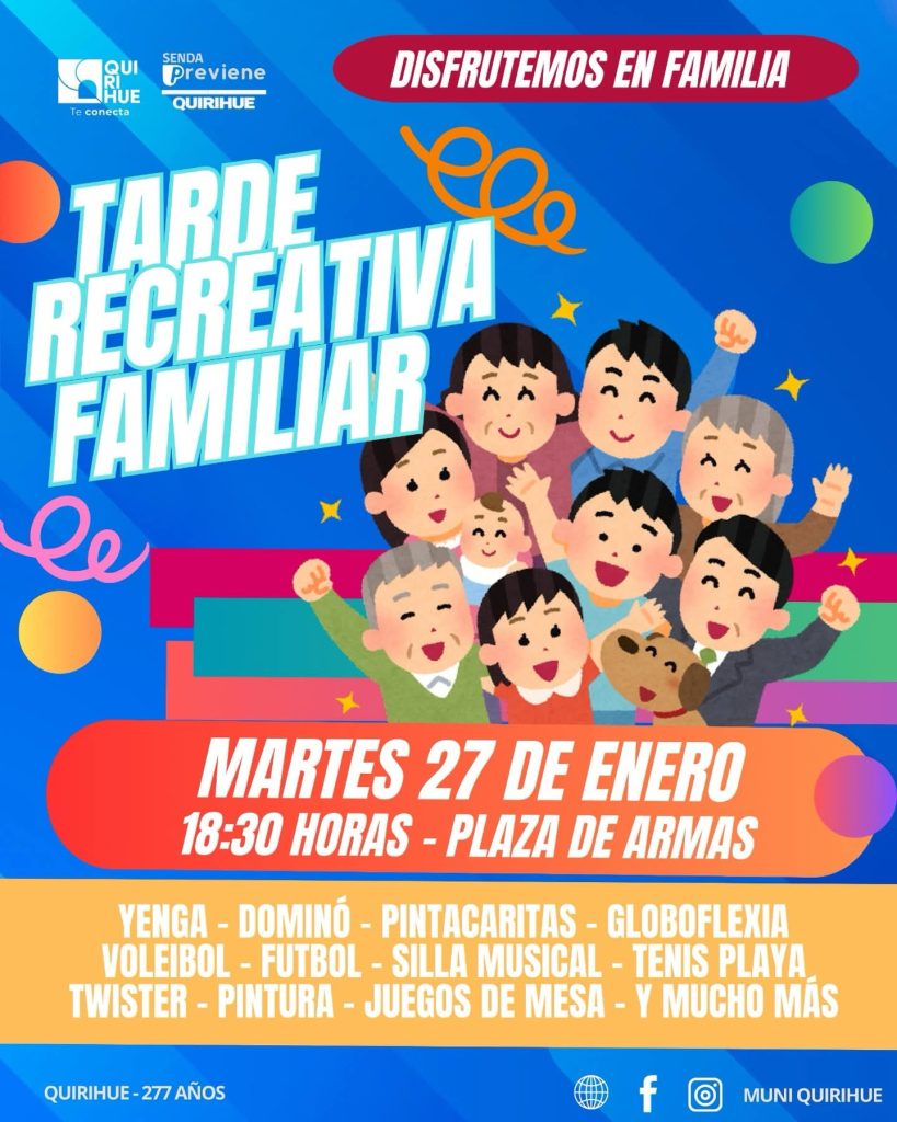 Este martes 27 de enero, la Plaza de Armas de Quirihue se llenará de juegos, risas y actividades pensadas para toda la familia. Desde las 18:30 horas, vecinos y visitantes podrán disfrutar de dinámicas como yenga y dominó gigante, pintacaritas, globoflexia, vóleibol, fútbol, tenis de playa, Twister, dibujos con tiza y témpera, además de juegos de mesa y muchas sorpresas.