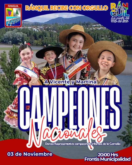 Noticia breve: La Ilustre Municipalidad de Ránquil invita a toda la comunidad a participar en el homenaje a Vicente y Martina, quienes se coronaron campeones nacionales en el Campeonato Infantil de Danza Representativa “La Camelia”. El evento se realizará este lunes 3 de noviembre a las 20:00 horas en el frontis del edificio municipal. La celebración destaca el orgullo local por el talento y dedicación de estos jóvenes representantes de la cultura chilena.