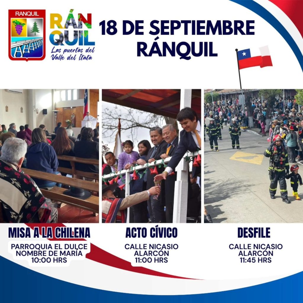 Este miércoles 18 de septiembre, la comuna de Ránquil conmemora las Fiestas Patrias con una jornada llena de tradición y comunidad. Las actividades comienzan a las 10:00 hrs con una Misa a la Chilena en la Parroquia El Dulce Nombre de María, seguida a las 11:00 horas por un acto cívico en calle Nicasio Alarcón. A las 11:45 hrs, el desfile oficial reunirá a instituciones locales, destacando el compromiso y la identidad de Ránquil como “Las puertas del Valle del Itata”.