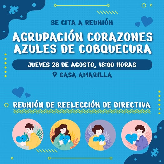 La Agrupación Corazones Azules de Cobquecura ha citado a sus miembros a una reunión el jueves 28 de agosto a las 18:00 horas en la Casa Amarilla. El encuentro tiene como objetivo la reelección de la directiva, marcando un momento importante para la continuidad organizativa del grupo.