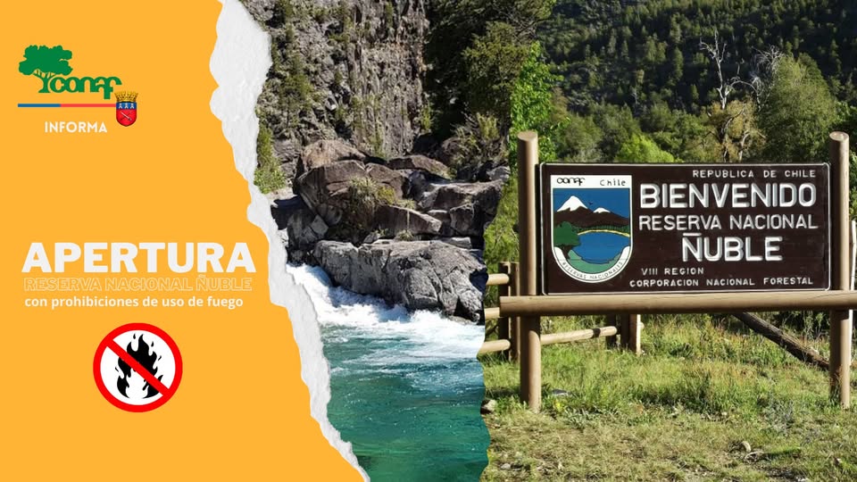La Corporación Nacional Forestal (CONAF) informó que, a partir del 27 de enero, la Reserva Nacional Ñuble se encuentra abierta de manera parcial, según Resolución N.° 22/2026. El único sector habilitado para visitas es El Trumao, manteniéndose la prohibición absoluta del uso de fuego. Los pases de ingreso deben adquirirse en pasesparques.cl y presentarse junto a la cédula de identidad.