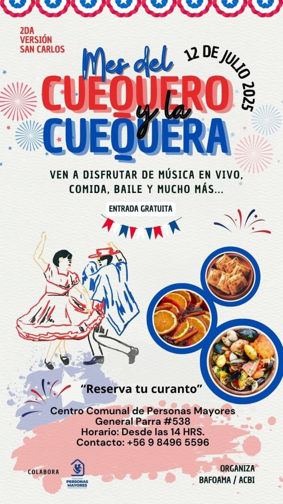 Este sábado 12 de julio de 2025, la comuna de San Carlos vivirá una jornada llena de folclore, sabores típicos y cultura nacional con la segunda versión del evento “Mes del Cuequero y la Cuequera”. La actividad se llevará a cabo en el Centro Comunal de Personas Mayores, ubicado en General Parra #538, desde las 14:00 horas, y contará con entrada totalmente gratuita.