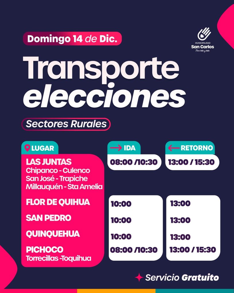 La Municipalidad de San Carlos anunció un servicio de transporte gratuito para facilitar el voto de residentes en sectores rurales este domingo 14 de diciembre. Las rutas incluyen localidades como Las Juntas, Pichoco, Flor de Quihua, San Pedro y Quinquehua, con salidas programadas entre las 08:00 y 10:30 horas, y retornos desde las 13:00. Esta iniciativa busca asegurar la participación democrática de todos y todas, sin importar la distancia.