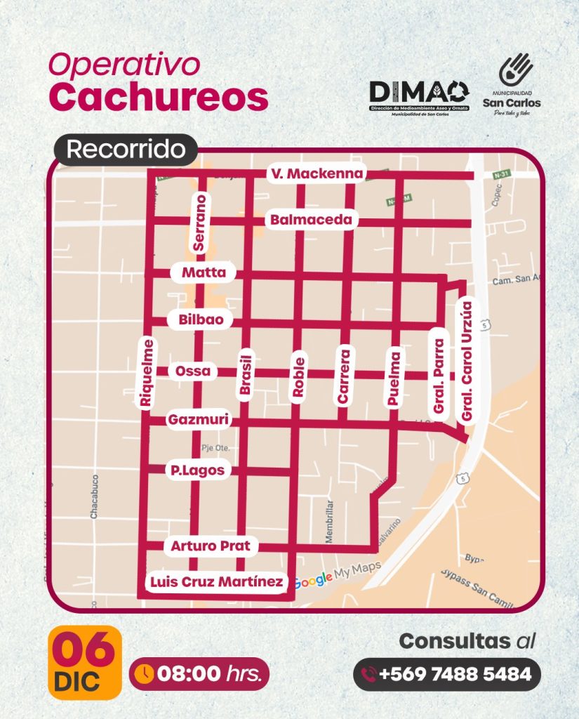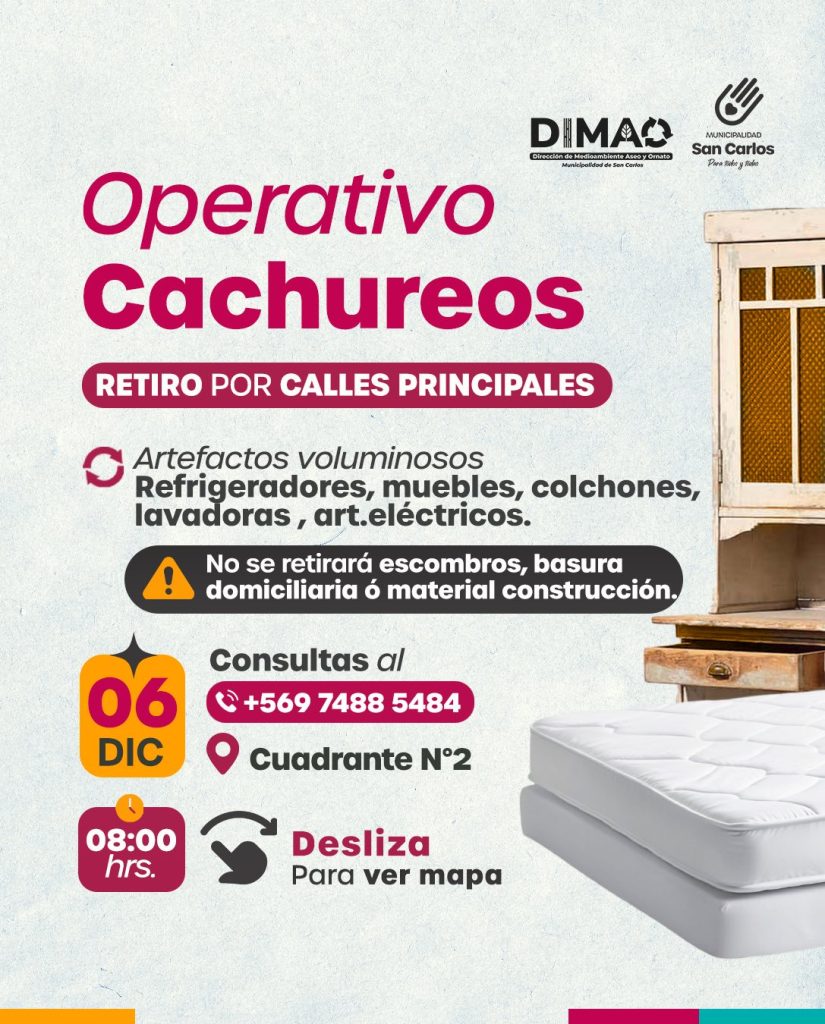 La Dirección de Medioambiente, Aseo y Ornato (DIMAO) junto a la Municipalidad de San Carlos llevará a cabo el “Operativo Cachureos” este miércoles 6 de diciembre desde las 08:00 hrs. en el Cuadrante N°2. Se retirarán artículos voluminosos como colchones, muebles, refrigeradores, lavadoras y electrodomésticos desde las principales calles del sector. No se aceptará escombros, basura domiciliaria ni materiales de construcción.