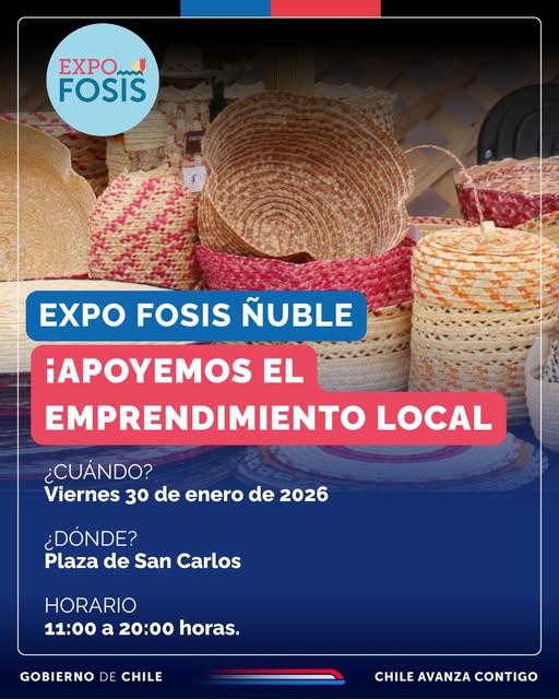 Este viernes 30 de enero, la Plaza de San Carlos será el epicentro del emprendimiento regional con la realización de la Expo FOSIS Ñuble. Desde las 11:00 hasta las 20:00 horas, más de una decena de emprendedores locales exhibirán sus productos, destacando la riqueza artesanal y creativa de Ñuble.