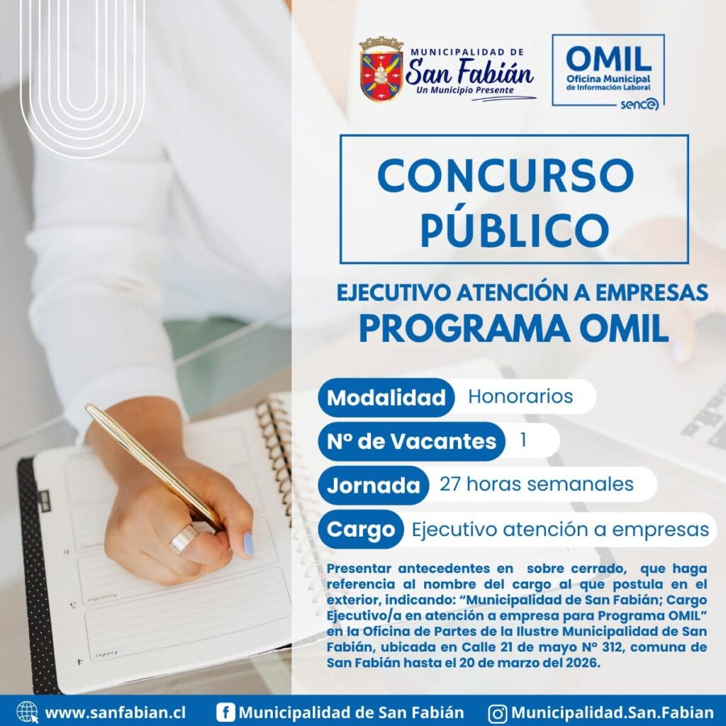 La Ilustre Municipalidad de San Fabián informó la apertura de un concurso público para el cargo de Ejecutivo/a de Atención a Empresas en el marco del Programa OMIL.