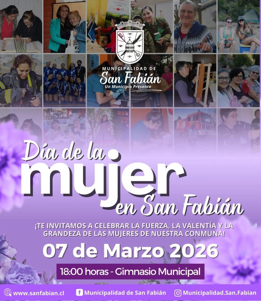 La Municipalidad de San Fabián invita a toda la comunidad a conmemorar el Día de la Mujer este sábado 7 de marzo a las 18:00 horas en el Gimnasio Municipal.