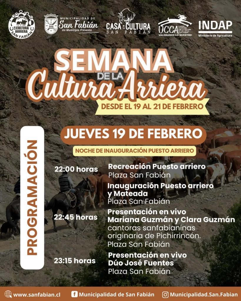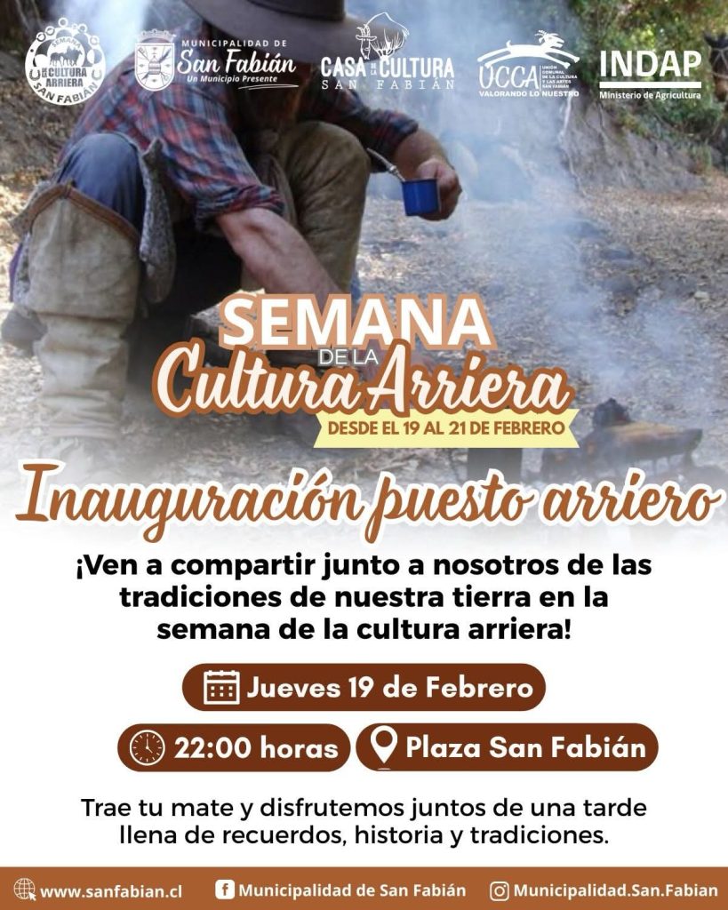 La inauguración contará con la recreación de un puesto arriero y una mateada comunitaria, seguida de presentaciones en vivo de artistas locales como Mariana y Clara Guzmán, y el dúo José Fuentes. Organizado por la Municipalidad de San Fabián junto a Casa de la Cultura, UCCA e INDAP, el evento invita a compartir música, historia y tradiciones que fortalecen la identidad de la comuna.
