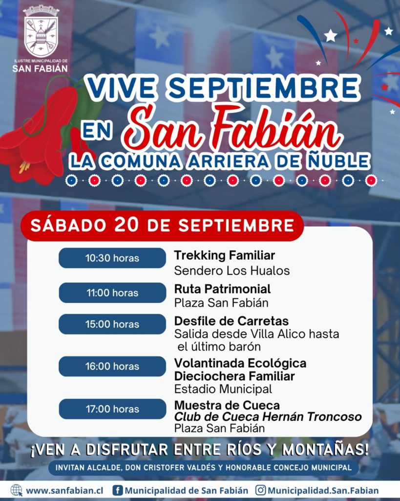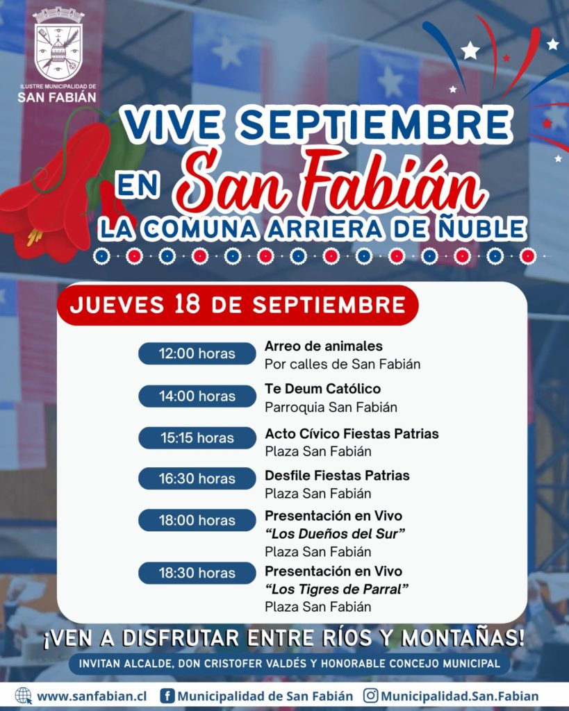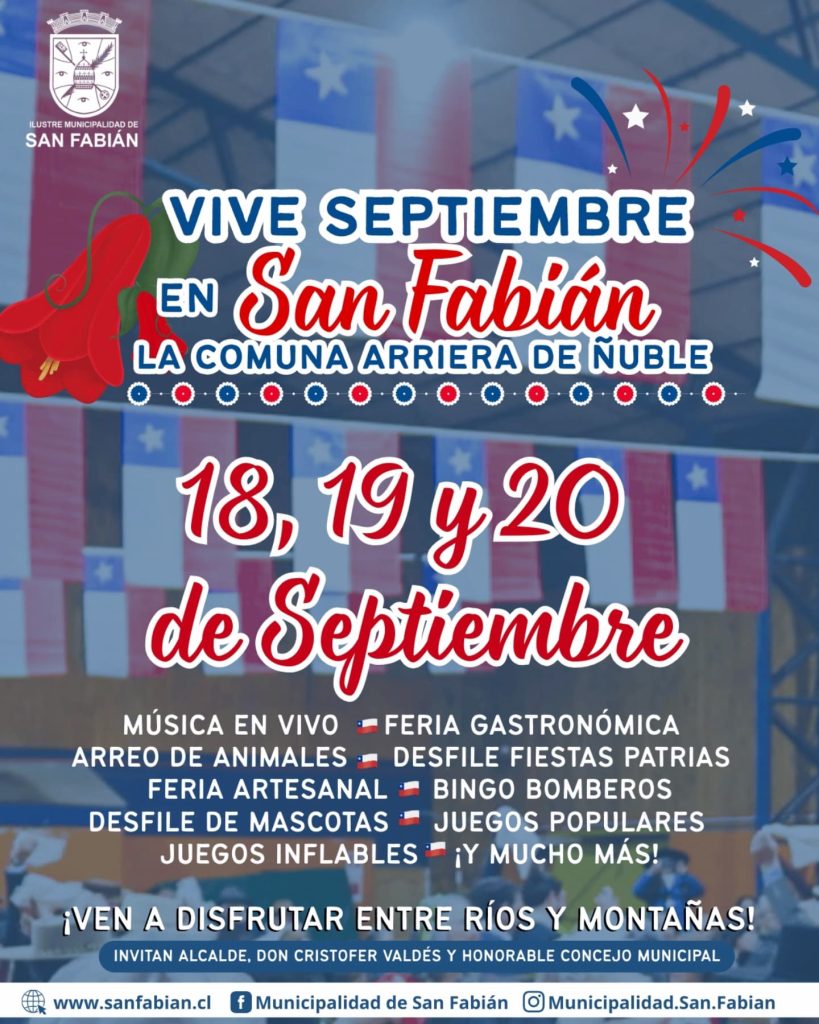 San Fabián se prepara para vivir tres días de fiesta con identidad arriera y espíritu comunitario. Del 18 al 20 de septiembre, la comuna ofrecerá una variada programación que incluye música en vivo, ferias gastronómica y artesanal, desfile de Fiestas Patrias, arreo de animales, bingo de bomberas, juegos populares e inflables, y mucho más. La invitación, extendida por el alcalde Cristófer Valdés y el honorable concejo municipal, promete una celebración inolvidable “entre ríos y montañas”, destacando las tradiciones locales y el orgullo ñublensino.