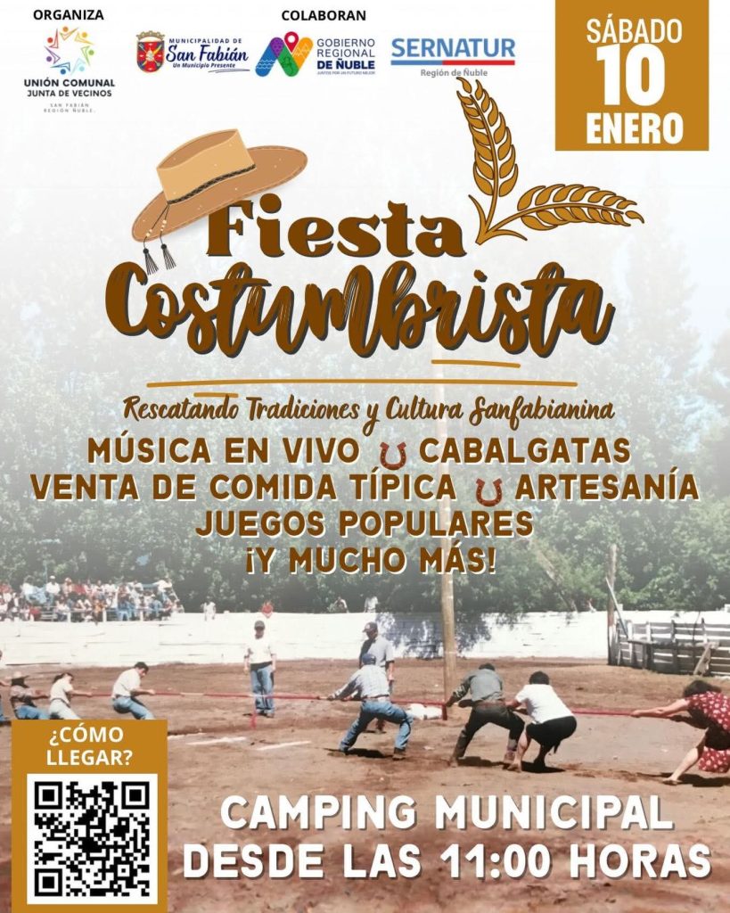 La comuna de San Fabián vivirá una nueva edición de la Fiesta Costumbrista “Rescatando Tradiciones y Cultura Sanfabianina”, organizada por la Unión Comunal de Juntas de Vecinos con apoyo de la Municipalidad, el Gobierno Regional de Ñuble y SERNATUR. La jornada se realizará el sábado 10 de enero, iniciando a las 11:00 horas con una cabalgata junto al Club de Huasos Puelche de Malalcura y continuará con la inauguración oficial a las 14:00 horas en el Camping Municipal. Música, folclore, competencias y stands darán vida a un encuentro familiar que busca fortalecer las raíces y costumbres locales.