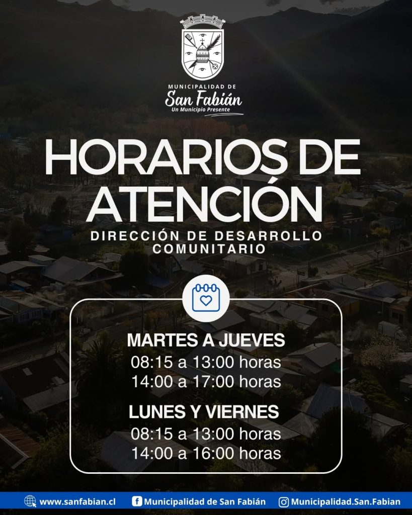 La Municipalidad de San Fabián comunicó los horarios actualizados de atención para la Dirección de Desarrollo Comunitario. De martes a jueves, el servicio estará disponible de 08:15 a 13:00 horas y de 14:00 a 17:00 horas. Los lunes y viernes, la atención se extenderá hasta las 16:00 horas en jornada vespertina.