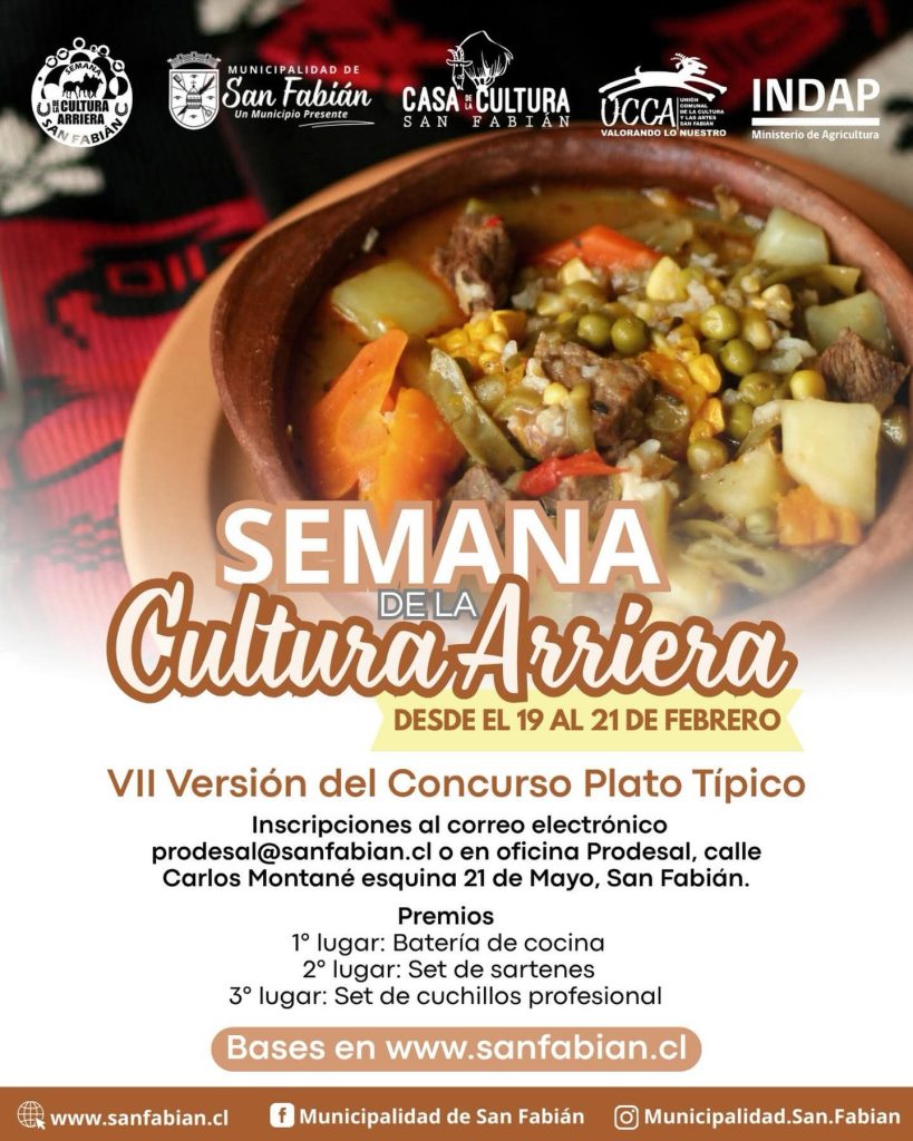 En el marco de la Semana de la Cultura Arriera 2026, la Municipalidad de San Fabián, junto al Alcalde Cristofer Valdés González y el Honorable Concejo Municipal, convocan a vecinos y vecinas de la comuna a ser parte de la séptima edición del Concurso Plato Típico, iniciativa que busca fortalecer y difundir la identidad gastronómica local.